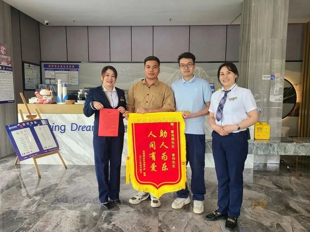 柳州格瑞米公司董海勇、曾偉兩名員工助人為樂的善舉獲得河池市南丹縣某酒店的稱贊,酒店經理為董海勇、曾偉贈送“助人為樂,人間有愛”的錦旗和感謝信。