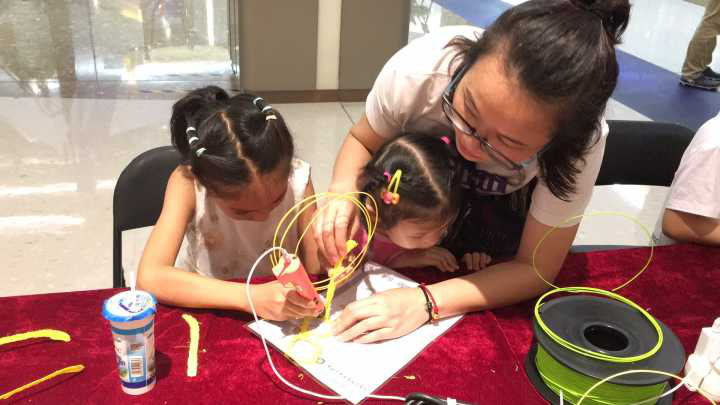 “3D·啟智·童(同)樂”展區主要結合“六一”主題和三祺廣場“新教育”的區位優勢,開展面向兒童的3D打印科普親子體驗活動。無論是3D打印筆區域、3D打印機區域都內容豐富,過程有趣,吸引了絡繹不絕的人群圍觀,尤其是3D打印煎餅和巧克力成了大家的注腳點,邊看邊嘖嘖稱奇。孩子們可以體驗DIY美食的樂趣,可以實現畫出立體的圖畫,傳遞了科普的知識性、實用性和趣味性,大人和小孩樂在其中,從而激發了孩子們愛思考、樂創造、勤動手等的良好品質。