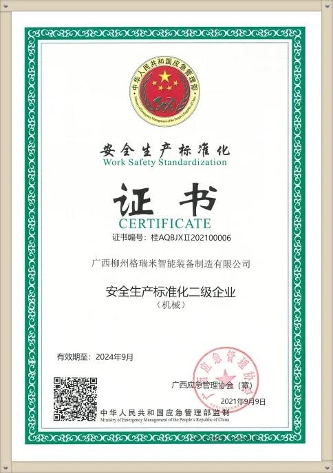 2021年10月27日,柳州格瑞米公司順利通過安全生產標準化評審,取得廣西應急管理協會簽發的認證證書,成為安全生產標準化二級企業(機械)。