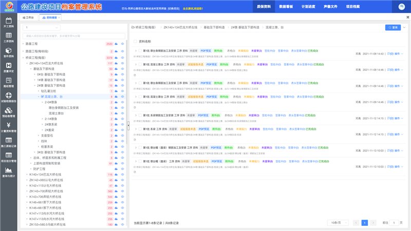 系統設置了管理性文件上傳、質保資料填報與簽批、聲像文件采集等模塊,具有較強的實用性。一是關聯度高,檔案管理系統可與各業務系統(計量、征拆、試驗等系統)實現集成溯源,接收數據文件,最終匯總形成案卷總目錄進行檔案封裝。二是可實現資料的快速簽批,參建單位質保資料全部實現電子簽章線上簽批,有效提高審批效率。三是質保資料與現場施工進度相同步,其中標段質保資料模塊、總監辦抽檢資料模塊是用戶使用頻次最多的核心模塊,按照用戶反饋不斷加深優化,通過wbs(單位分部分項)智能參數化劃分功能,項目資料填報從手動新增,變成系統自動批量生成,效率提升75%以上。除資料填報效率高的同時,目前系統采用法律認可的電子簽章技術,通過標準化數據接口,對oa、征拆、計量、質量等多個系統數據實現一鍵歸檔,效率提升60%以上,極大提高了的工作效率,有效降低了參建單位的人力成本、時間成本、管理成本。四是系統已實現一鍵評定、自動預組卷、線上案卷封裝等功能;五是實現公路建設項目電子檔案驗收管理系統的應用;六是運維團隊能夠及時響應,由公路、檔案、信息化組成的專業項目團隊線上全年度24小時維護,線下按階段定期上門跟蹤回訪。