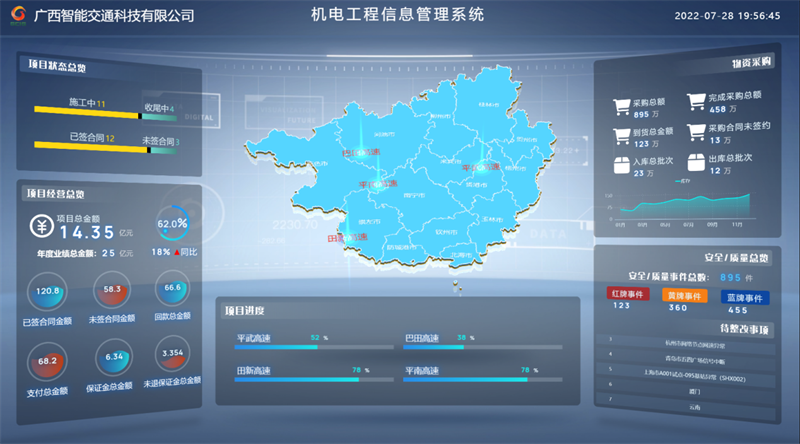 團(tuán)隊(duì)還自主研發(fā)并啟用田新機(jī)電項(xiàng)目工程信息管理系統(tǒng),該系統(tǒng)可實(shí)現(xiàn)工程信息可視化、過(guò)程管理信息化、工程管控智能化,形成“施工進(jìn)度一張圖”,可以直觀地展現(xiàn)田新路整體施工情況,極大地優(yōu)化了施工人員及車(chē)輛、安全隱患情況、質(zhì)量管理、進(jìn)度管理、變更情況的管理,提升了項(xiàng)目部對(duì)施工的管控力度,做到了危險(xiǎn)源精準(zhǔn)識(shí)別管控,保障了項(xiàng)目施工的安全平穩(wěn)運(yùn)行,同時(shí)為人力資源調(diào)配、設(shè)備物資采購(gòu)及調(diào)撥提供了極大參考價(jià)值。