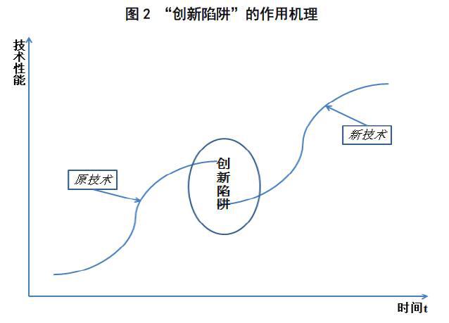 “創新陷阱”正是產生于這種新舊技術的更替過程中(參見圖2)。具體來說,對于一家企業,從原有技術軌道跨向新技術軌道是一件不容易的事情;企業越是在自己原有的技術專長上加以創新,便會在原有技術軌道上走得越遠;也正因為如此,企業也便越會延滯進入新的技術軌道,進而也越來越遭受舊技術極限的扼制。