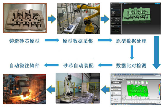 產品質量檢測是企業生產現場在線工作模式,是一個生產線的工位,對測量設備精度和功能的要求遠超過反求設計。因此,該檢測系統可無縫應用于產品質量在線檢測,如鑄造、鍛壓及注塑等生產線上的鑄件、鍛件、沖壓件、注塑件等復雜曲面產品檢測,“一鍵式”全自動完成掃描檢測流程,保證最佳的測量精度和速度,實現質量控制(QC)與部件生產環節緊密結合。主要技術包括: